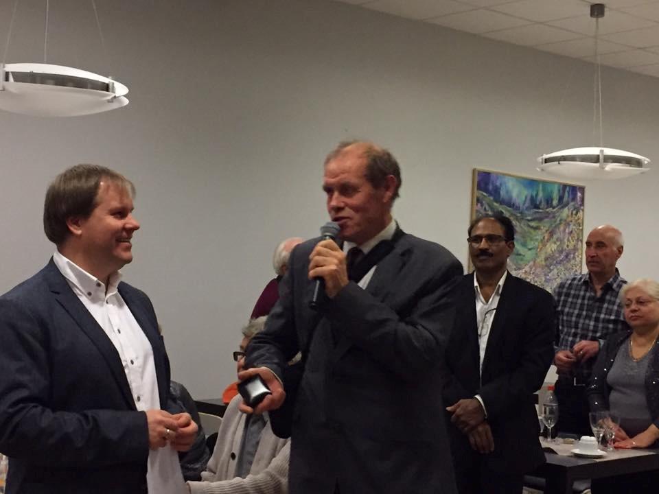 Bildet er av Bjørn Roger Johansen til venstre og Arild Hovslien til høyre under overrekkelsen av hedersnålen i gull.