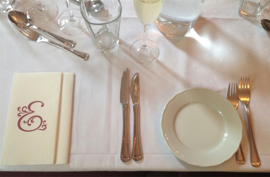 Borddekkingen er enkel og stilren med en «rosemalt» E på servietten.
