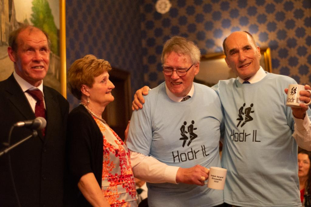 Kari Brevik og Arild Hovslien overrekker Hodr-T-skjorte og krus til de nyutnevnte æresmedlemmene, Gunleik Bergrud og Olav Slaattelid.