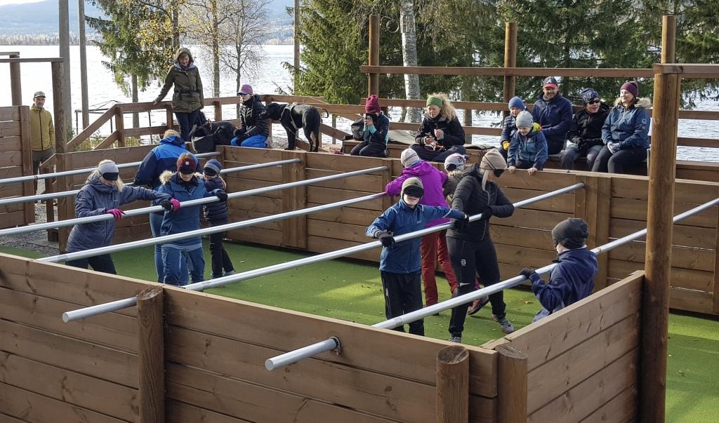 Lørdag var det et strålende høstvær og tid for uteaktiviteter. Før lunsj fikk store og små utfordre seg i høydebanen, både med og uten blindfold. Etter en pause i Gamma med steking av vafler og hyggelig samvær, var det tid for human fotball. Det er et lagspill der alle deltar med blindfold og hvor to lag spiller mot hverandre med en fotball med lyd. Et spill som engasjerer alle.