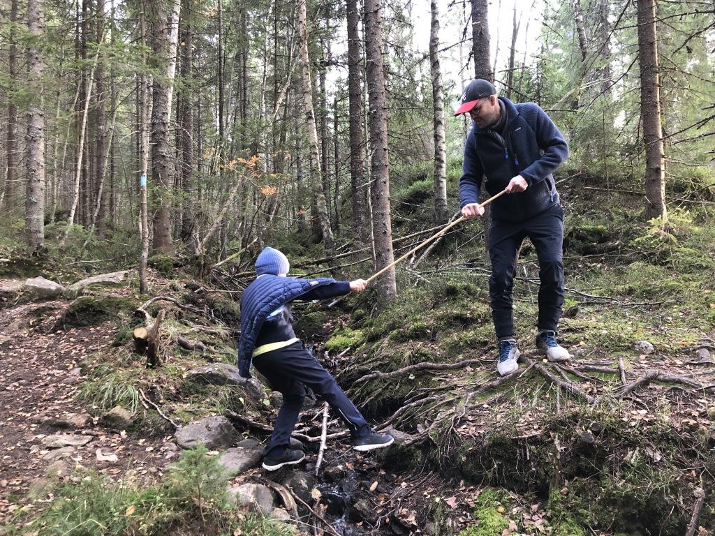 Skogstur: Perfekt bekkepassering av far og sønn med den nypresenterte teknikken.