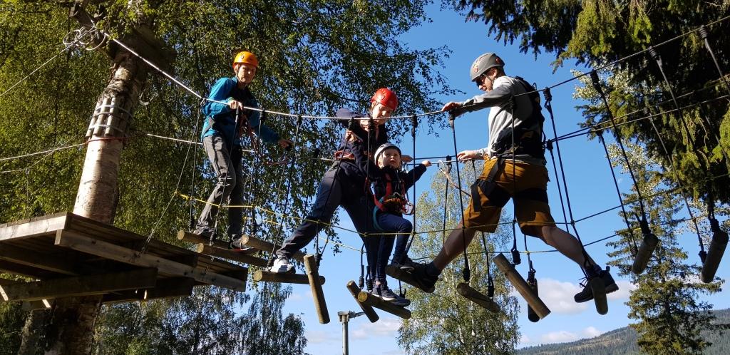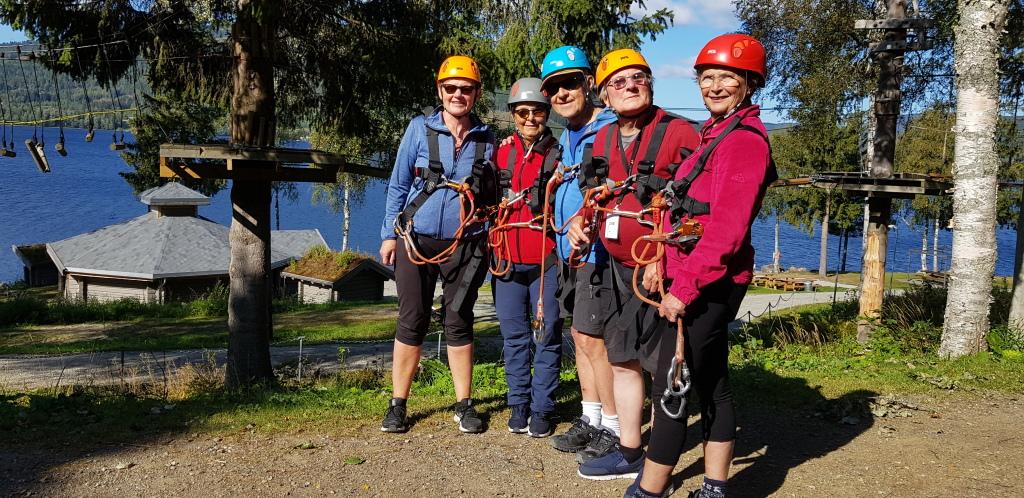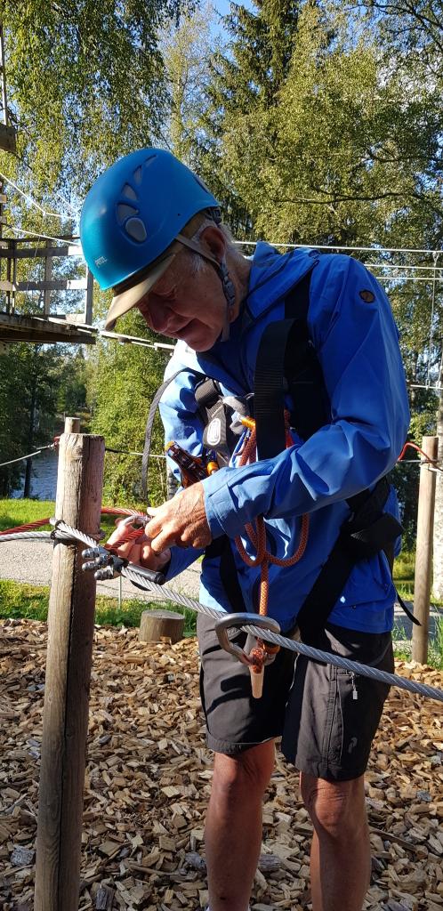 Lørdag begynte med plan for dagen-møte der programmet ble diskutert og kabalen med fordeling av våre verdifulle ledsagere ble lagt. Hovedaktivitet: høydebanen, der man beveger seg på gyngende underlag 4-5 meter over bakken, ofte bare balanserende på en wire. Men først en sikringssele som skulle koples til en kraftig wire, så man ikke skulle falle mer enn 1/2 meter om man mistet fotfestet. Ettersom vi var blitt 3 år eldre siden forrige gang, var nye og gamle strekninger i høydebanen blitt enda skumlere og ballansen enda dårligere. Referenten er svaksynt og forstår ikke hvordan blinde klarer å takle de finurlige hindrene. Den som syntes dette var aller mest gøy, var fireårige Sander. Noen syntes nok det var vel skummelt og valgte en løpe-, fot- eller tandemsykkeltur i stedet.