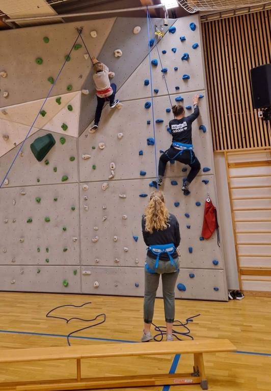 Etter middag fredag kveld kunne barna velge mellom aktiviteter i gymsalen, som klatring og teppecurling eller lek med ball. Klatringen var organisert med kyndig veiledning av Tiril Wilhelmsen, som også kjenner barna fra de månedlige klatreøktene.