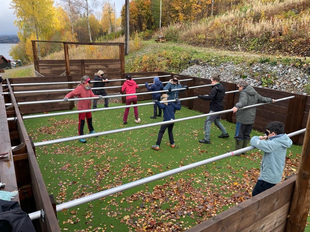 Søndag formiddag gikk vi en tur langs Hurdalssjøen i sansestien. Vi spilte human fussball. Det er et lagspill der alle deltar med blindfold og hvor to lag spiller mot hverandre med en fotball med lyd. Et spill som engasjerer alle. Vi spilte flere kamper og til slutt barn mot voksne, der barna gikk seirende ut. Etterpå var det steking av vafler og hyggelig samvær i Gamma, før felles lunsj og avreise.