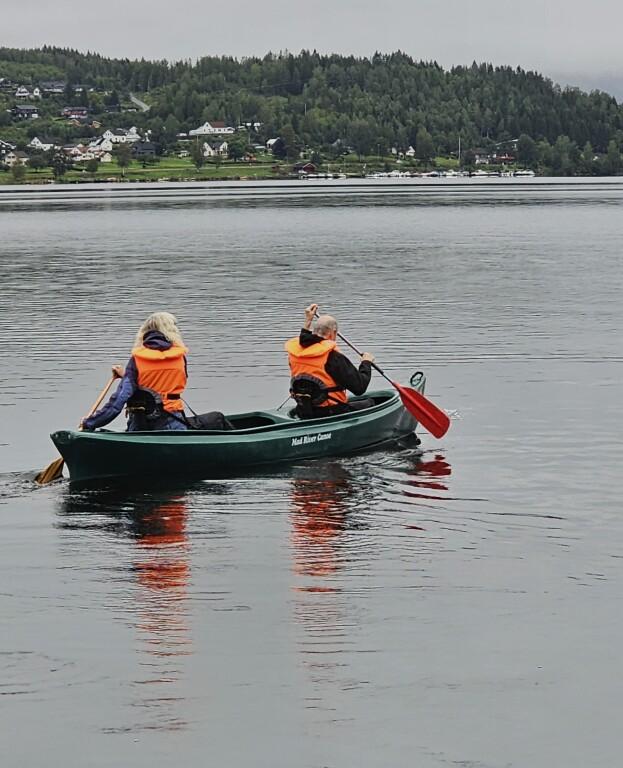Kano 2: Jarle og Tiril padler på langs på speilblankt vann.