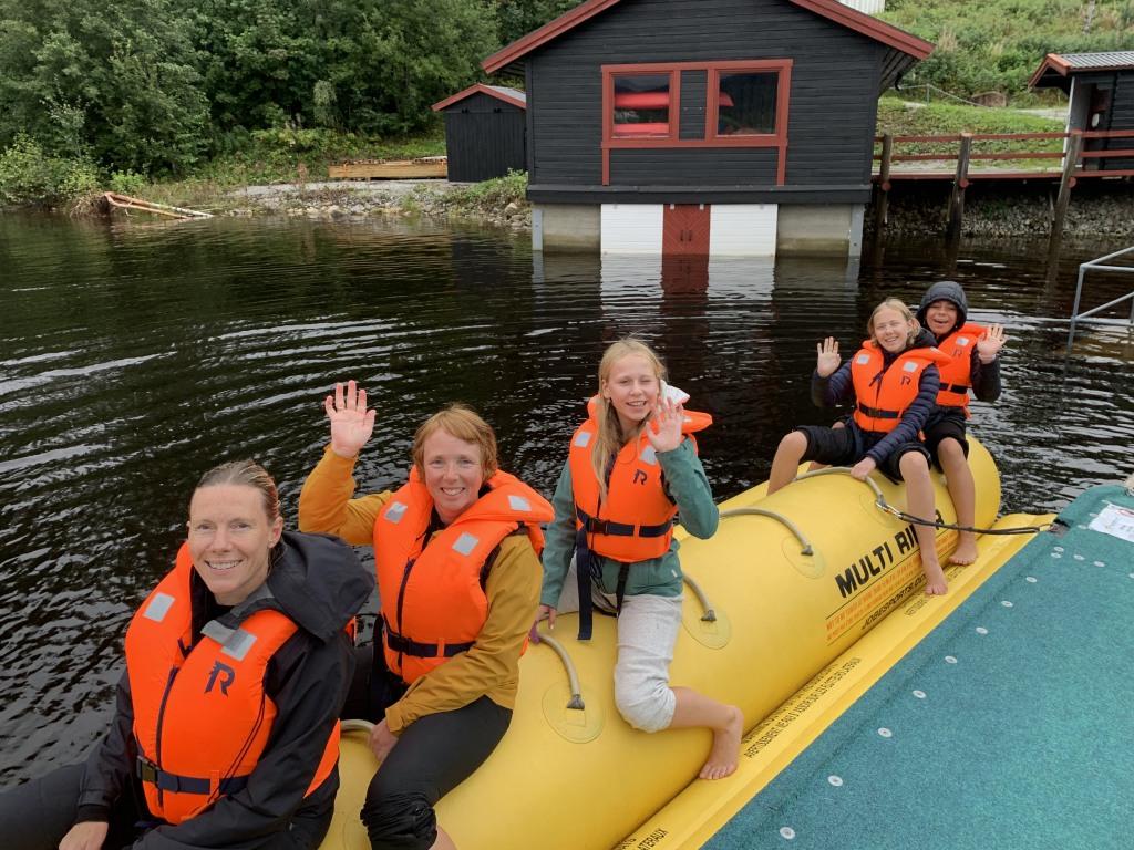 Lørdag 26.08.: Været var bedre enn varslet. Etter en stor og god frokost, gikk noen tur på Kinnavegen, andre jogget og resten dro ned til sjøen for padling på brett eller i kano, roing og kjøretur med «bananen». Et par friskuser tok til og med et bad i ca. 15 gr. i vannet. Hopp og sprett på ny trampoline var det også noen som prøvde. Det kom bare noen småskurer innimellom.