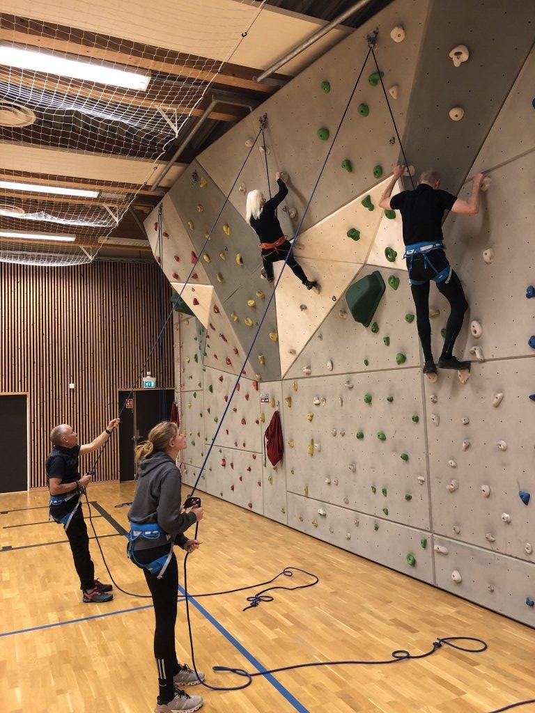 Klatreveggen: Else og Jarle i tau mot toppen, mens aktivitetslederne Jan Helge og Elin sikrer.