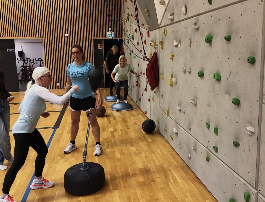 Gymsal 2: Else og Kathrine bokser i forgrunnen, mens Nina og Jorunn gjør styrke- og balanseøvelser i bakgrunnen.