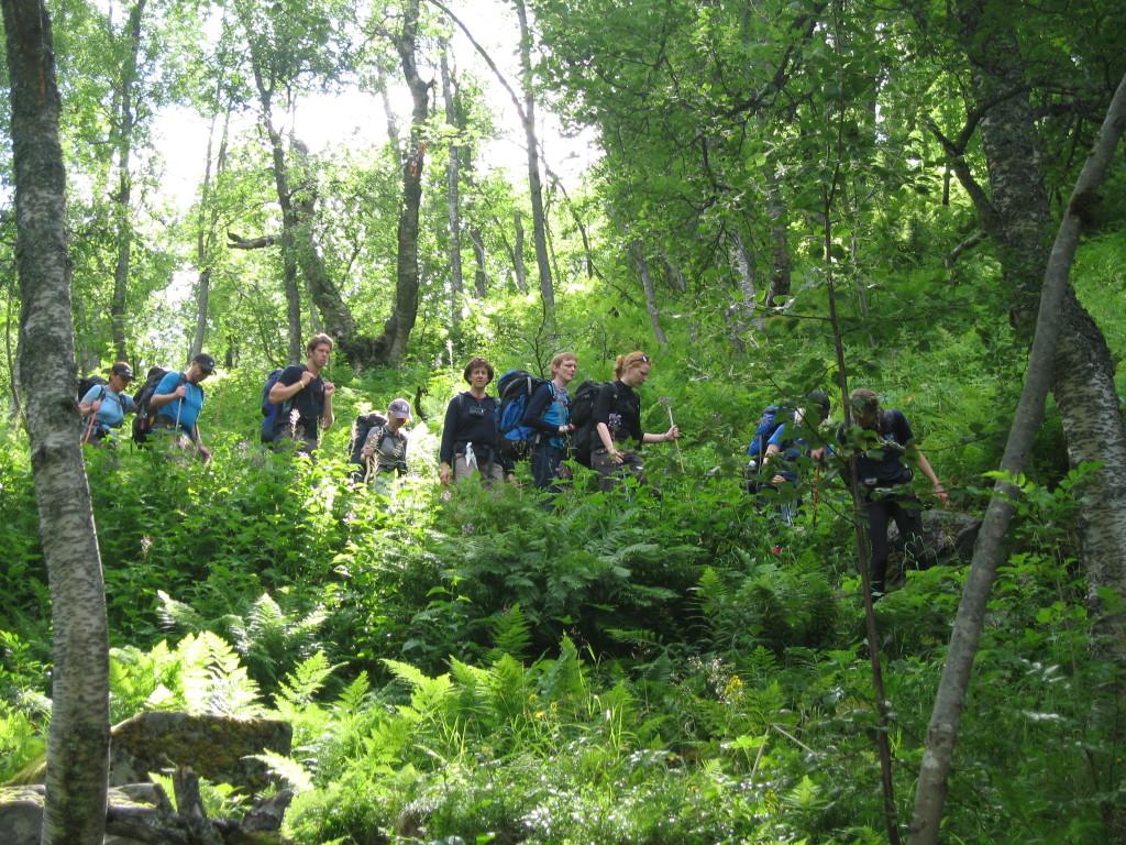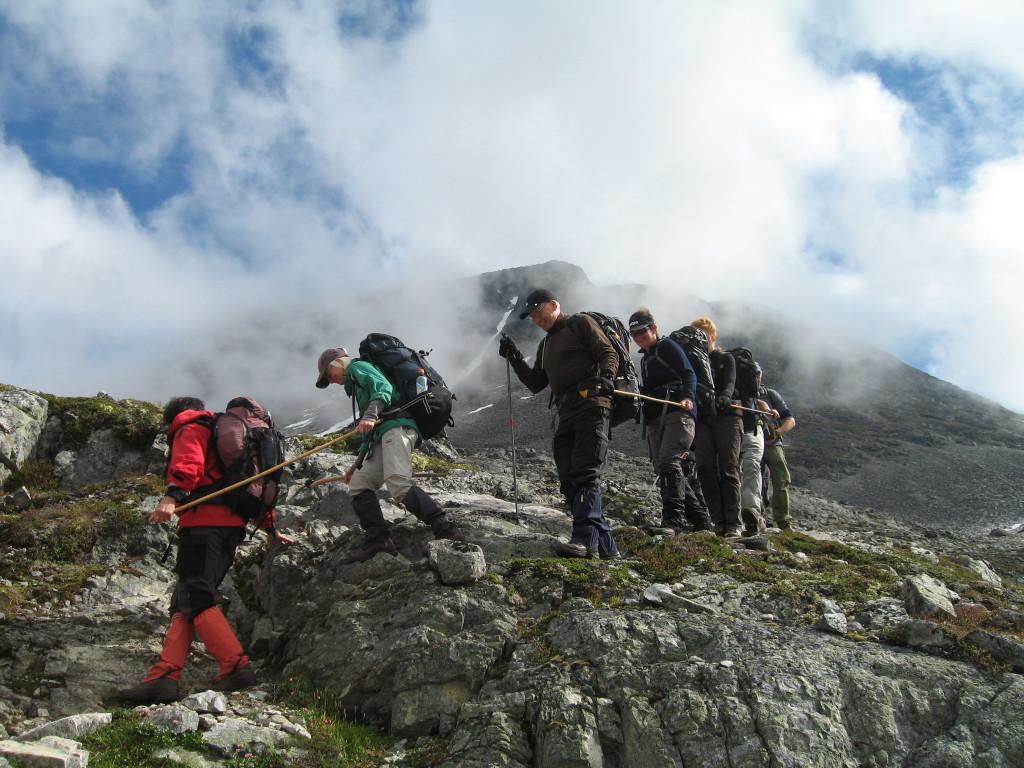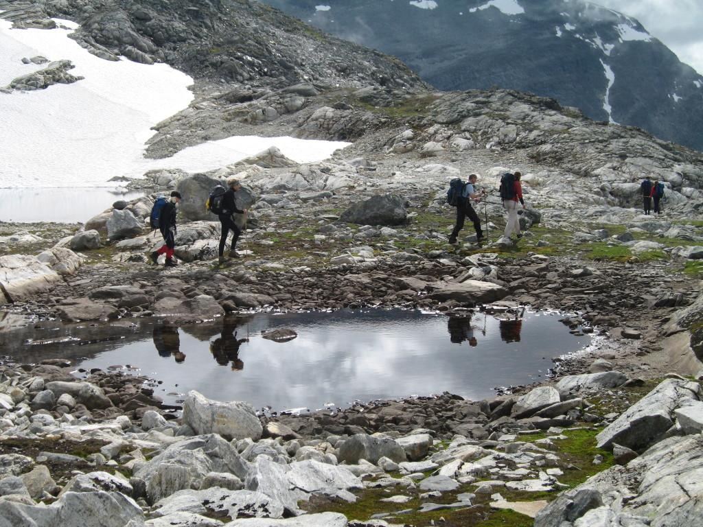 Etter togtur til Bjorli og en kort drosjetur til Tunga, kunne vi starte den første dagsmarsjen utpå ettermiddagen mandag 2. august. Turen gikk i en slak stigning langs dalføret inn til Pyttbua. Dette ble et første, fascinerende møte med Turistforeningens selvbetjeningshytter for våre utenlandske ledsagere, som umiddelbart fikk vise sin dugnadsånd foran gassblussene. Neste dagsmarsj til Reindalsseter var satt opp til seks timer og ble ansett for å være ukas mest krevende etappe. På grunn av et lite oppmuntrende varsel fra yr, hadde vi lagt om turen for å kunne gjennomføre denne etappen på tirsdag, under antatt bedre værforhold enn det som var varslet senere i uka. Det viste seg da også å bli et helt upåklagelig turvær, og takket være fast og tørt fjell samt oppmonterte wirer gikk den bratte stigningen opp mot løypas høyeste punkt, 1550 meter over havet, uten store problemer. Det var likevel en ganske sliten gjeng som ankom Reindalsseter temmelig sent, og en velfortjent dusj måtte utsettes til etter middag. Det kom derfor godt med at endringen av opplegget ga rom for en lett tur uten tung sekk neste dag, som igjen opprant med et ypperlig turvær til tross for yrs dystre varsler. Turen gikk inn til Huldrekoppen, og for noen videre innover mot Veltdalsbu, med retur samme vei. Underveis passerte vi et skilt som vakte interesse, med påskriften ”J. Rønneberg-råsa”. Forklaringen kom i form av en spennende god-natt-fortelling som hytteverten vartet opp med rett før sengetid. Skiltet viste til en ”hemmelig” sti som krigshelten, leder for tungtvannsaksjonen på Vemork, sunnmøringen Joachim Rønneberg og to kamerater brukte inn til et godt skjult og meget primitivt overnattingskvarter som de bodde i det siste krigsåret. Herfra drev de etterretning og sabotasjeaksjoner mot Raumabanen, men også tyveritokter til Reindalsseter for å skaffe seg mat.