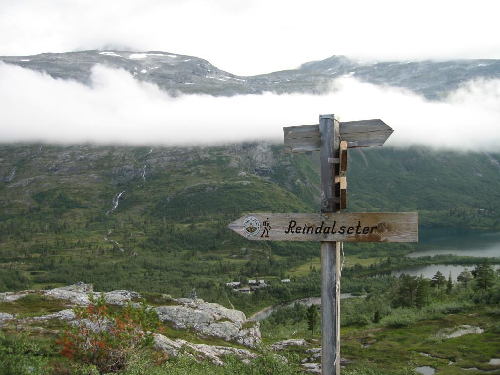 Skilt til Reindalseter, og hytta langt der nede.