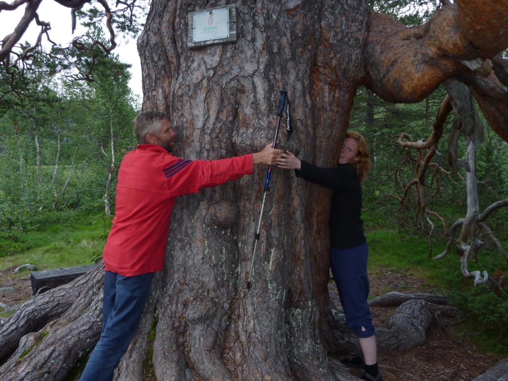 Jørund og Line prøver å rekke rundt kjempefurua.
