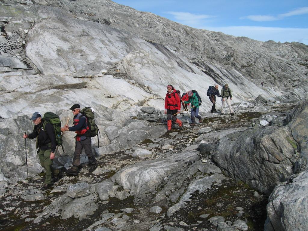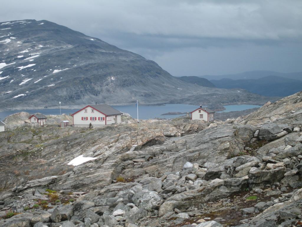 Den litt kortere turen til Danskehytta neste dag bød på utfordringer først og fremst for kretsløpssystemet, med sine 900 meter samlet stigning. Nå fikk omsider yr også rett i sine dystre værprognoser. Siste halvdel av turen gikk i det eneste regnværet vi opplevde hele uka. At det er populært å gå i fjellet fikk vi demonstrert her. Det ble satt rekord med 49 overnattende på en hytte som bare hadde 24 sengeplasser. Vi fikk imidlertid en romslig hems for oss selv, og med litt kreativitet klarte vi også å få tørket tøyet vårt så noenlunde. Det var ellers ikke mye som minte om Danmark i det golde, men likevel fascinerende steinlandskapet som denne selvbetjeningshytta, en gave fra danske DNT-medlemmer, var plassert i. Dette landskapet omga oss også på de første fem kilometerne av lørdagens avslutningsetappe. Nå var godværet kommet tilbake, og det ble en fin nedstigning i lett terreng mot Grotli, hvor sivilisasjonen ventet med sine onder, som trafikkstøy fra Strynefjellsveien, men også goder, som dusj, en velfylt middagsbuffet og gode senger. Dette historiske hotellet, opprinnelig bygget i 1905, ble en fin ramme om avslutningen av en meget vellykket og hyggelig fottur.