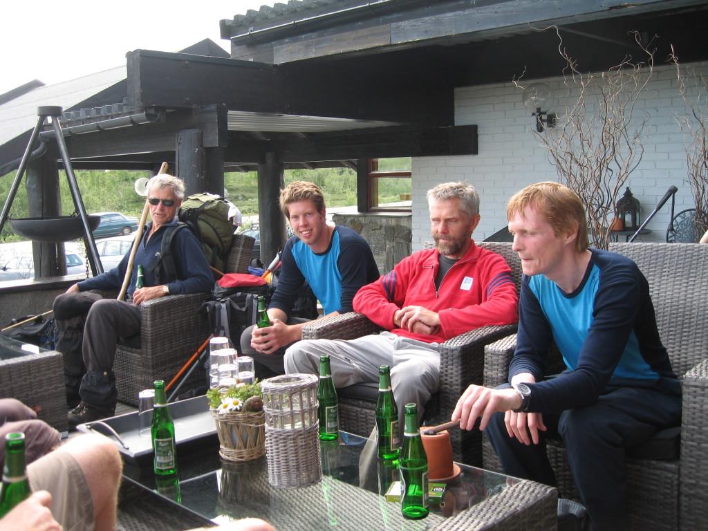 Per S., Bjørnar, Jørund og Lars på Grotlis terrasse. Alle med øl, men bare Lars med sigar.