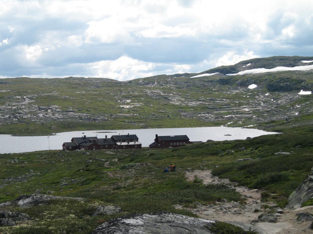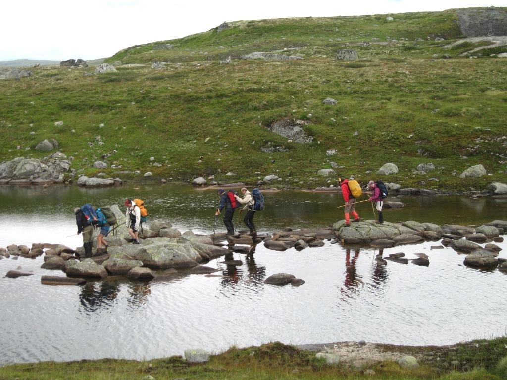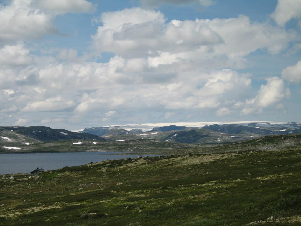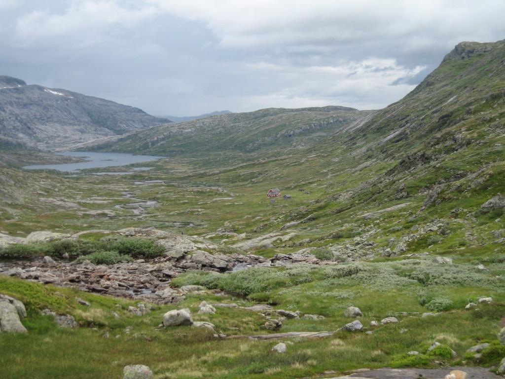 Dag 3 Kjeldebu – Liseth, 20 km og i utgangspunktet 5,5 timer. Vi startet dagen med å krysse Kjeldo på nytt, over brua.(bilde 031)Vi gikk stadig vestover. Landskapet begynte å bli grønnere og mere kupert, vi kunne ane Vestlandsnaturen foran oss. Det var neppe så mange tørre føtter ved dagens slutt, myrene var våte og tallrike. Det ble flere blomster å se, og vi hadde fin utsikt til Hardangerjøkulen i nord (bilde 049). Dagens høyeste punkt var på ca 1180 m.o.h. Det var bratt nedstigning mot slutten og ganske mye kratt. Bilder fra dagen: nr 031 – 049. Liseth er et pensjonat- og hyttetun 750 m.o.h. og det har vært drift der siden 1840.