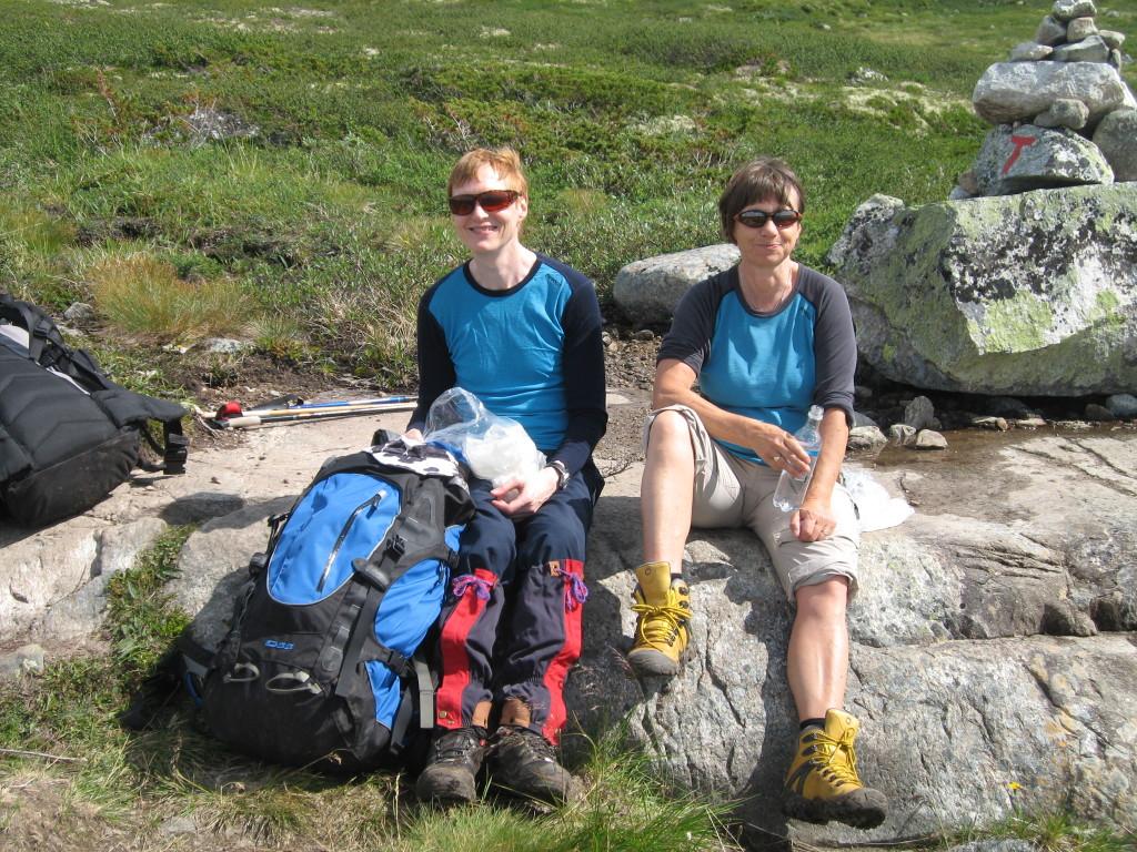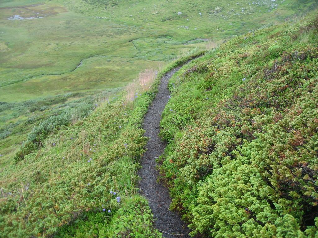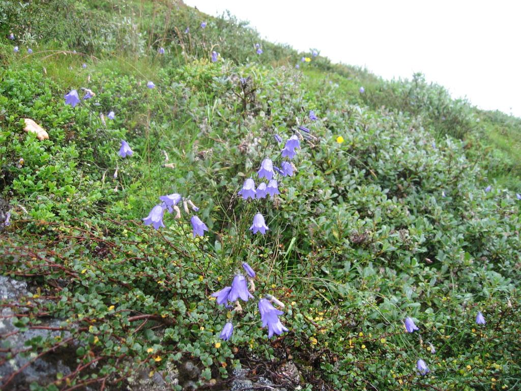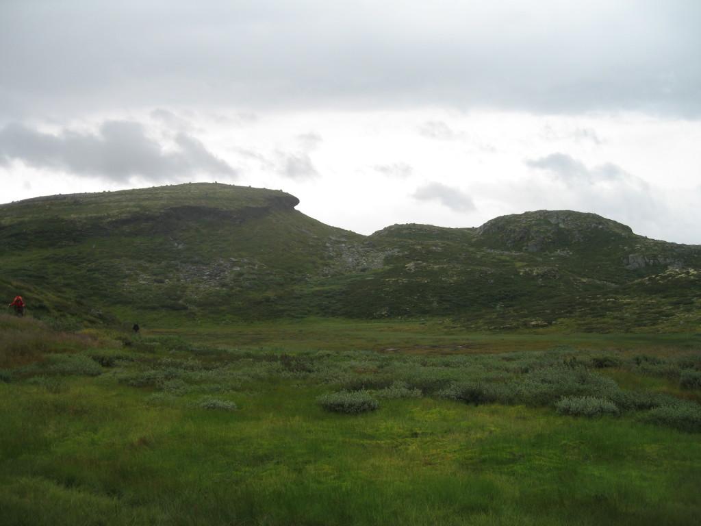 Dag 3 Kjeldebu – Liseth, 20 km og i utgangspunktet 5,5 timer. Vi startet dagen med å krysse Kjeldo på nytt, over brua.(bilde 031)Vi gikk stadig vestover. Landskapet begynte å bli grønnere og mere kupert, vi kunne ane Vestlandsnaturen foran oss. Det var neppe så mange tørre føtter ved dagens slutt, myrene var våte og tallrike. Det ble flere blomster å se, og vi hadde fin utsikt til Hardangerjøkulen i nord (bilde 049). Dagens høyeste punkt var på ca 1180 m.o.h. Det var bratt nedstigning mot slutten og ganske mye kratt. Bilder fra dagen: nr 031 – 049. Liseth er et pensjonat- og hyttetun 750 m.o.h. og det har vært drift der siden 1840.
