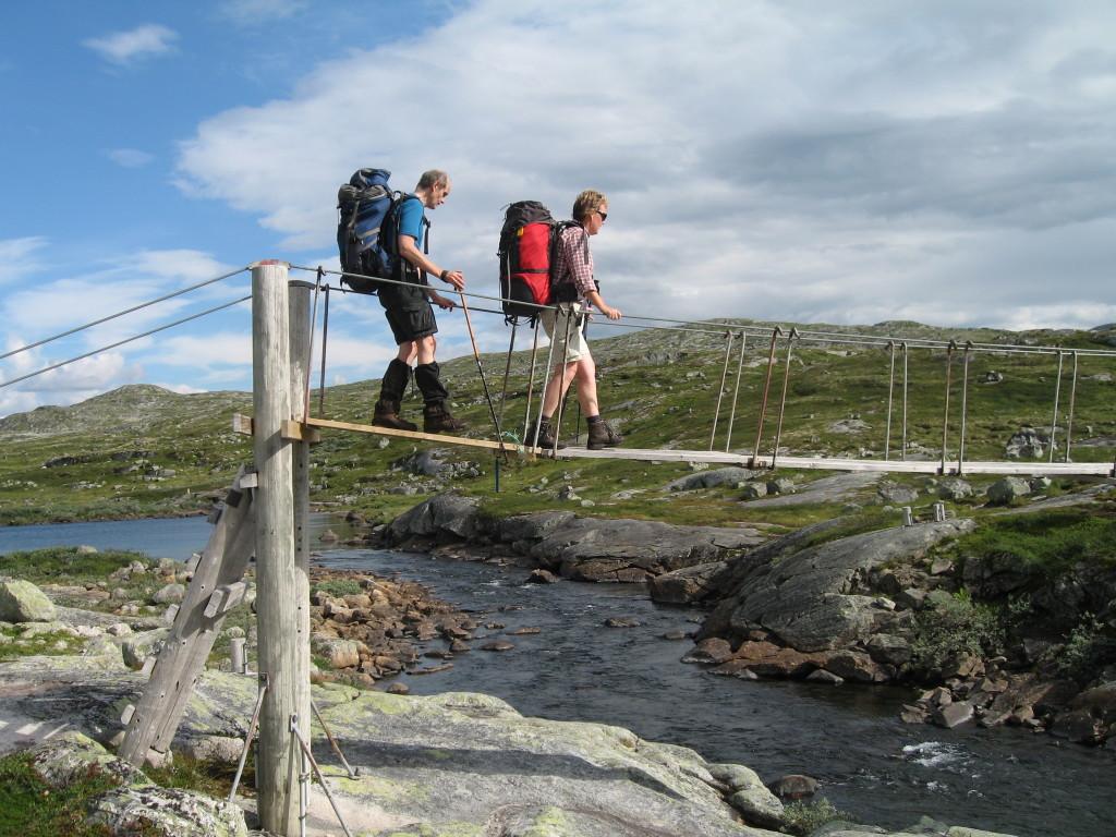 Jarle og Tove krysser hengebro før Kjeldebu.