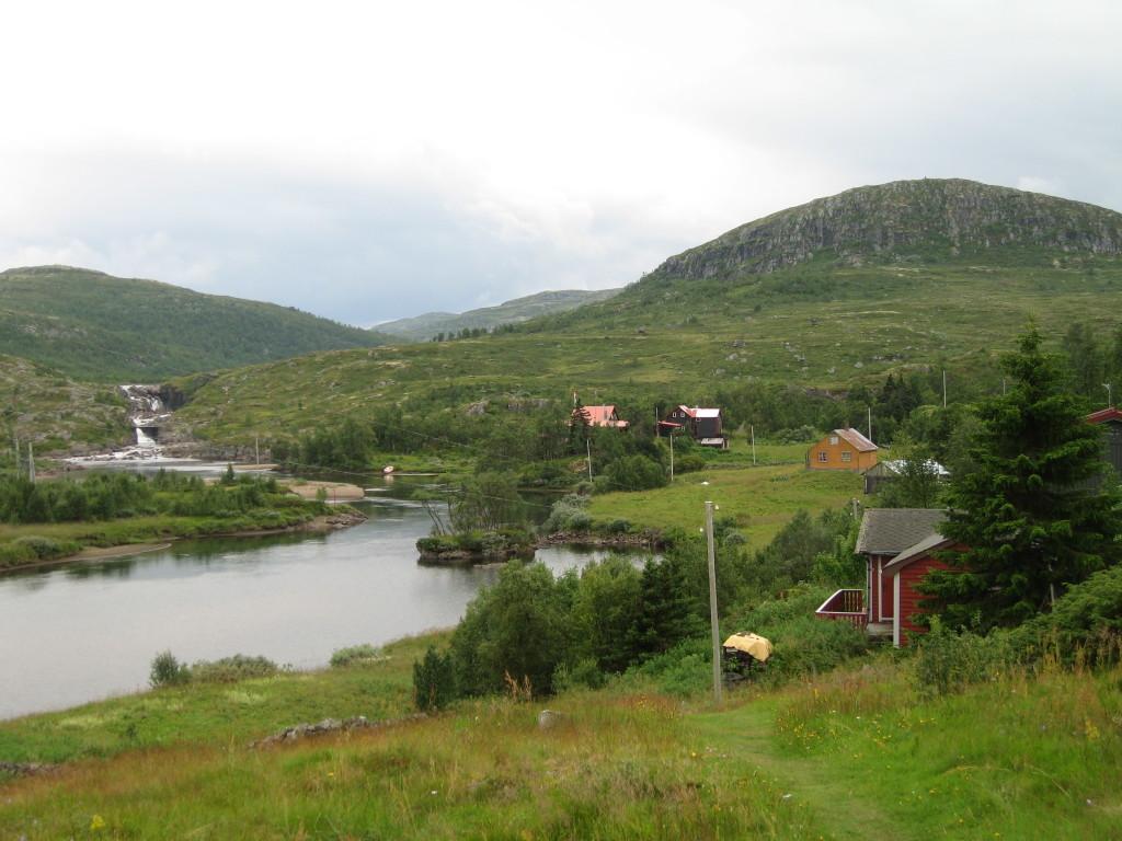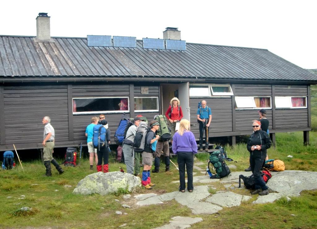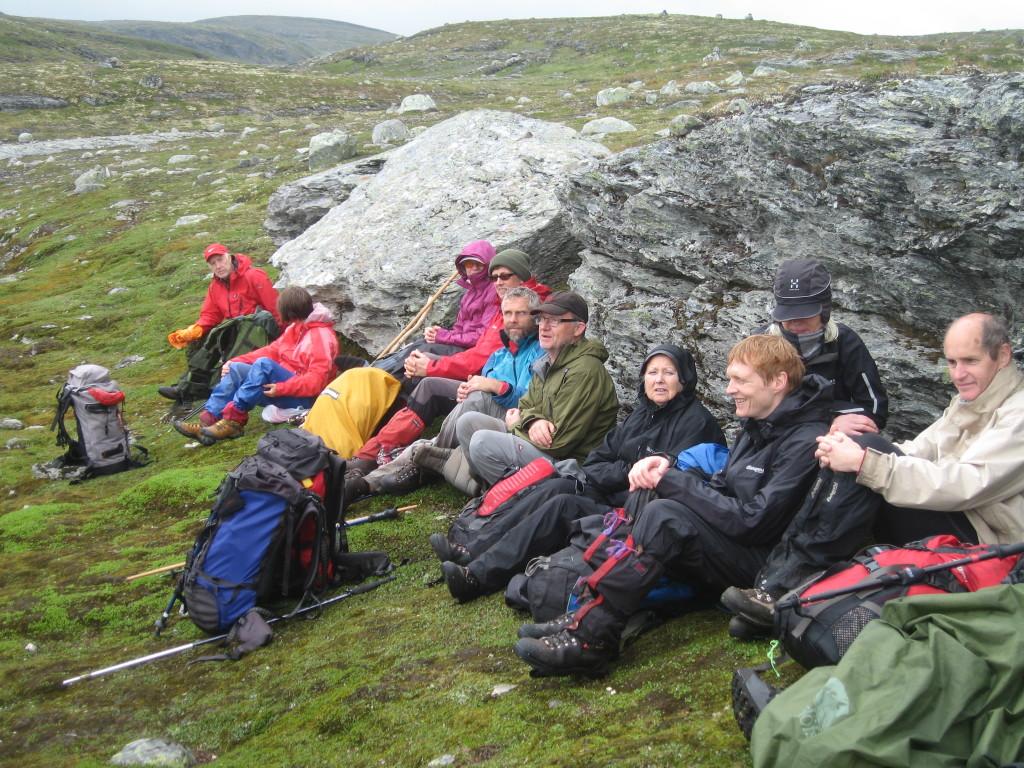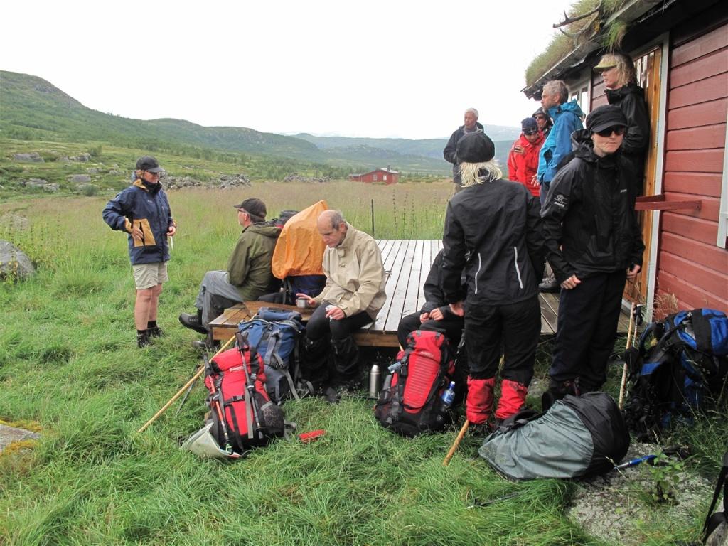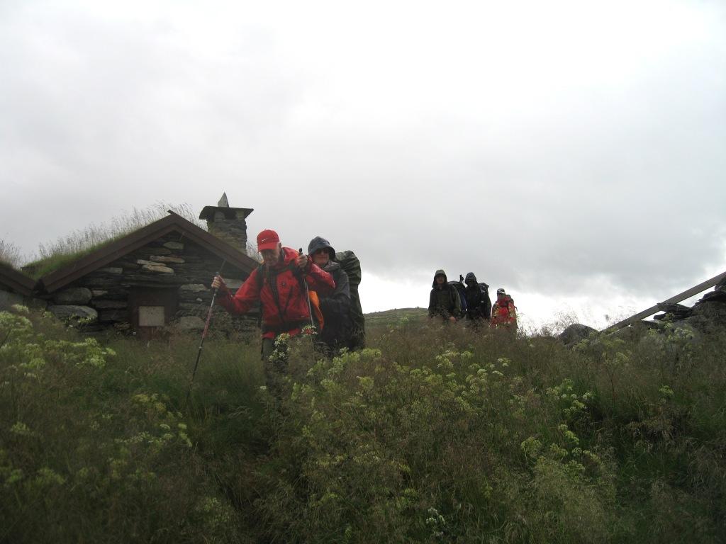 Dag 4 Liseth – Viveli 16 km og DNTs anslag 4,5 timer. Vi lette en stund etter stien, som viste seg å starte bak autovernet langs RV 7. Rast på Skitsete (!) før vi kom ned til Berastølen. Det regnet og var surt og kaldt (foto 062). Etappen bød på en del utfordringer i form av bjørkekratt, ulendt terreng og myrer. Myggen summet og gasset seg. Vi passerte rett ovenfor Hølmodalen som går ned mot Øvre Eidfjord, gikk langs Veig, krysset Vivo på bru før ankomst Viveli med klissvåte føtter etter masse myr. (bilder fra dagen 058 – 062) Viveli er en vakker plass beliggende 880 m.o.h. i Veigdalen med rik flora. Stedet er fra 1890 og utsmykket av tidligere vertskap. Ett hus på stedet er fra 1780. Vi fikk servert kumler til middag, herlig! Og så mette som vi ble!