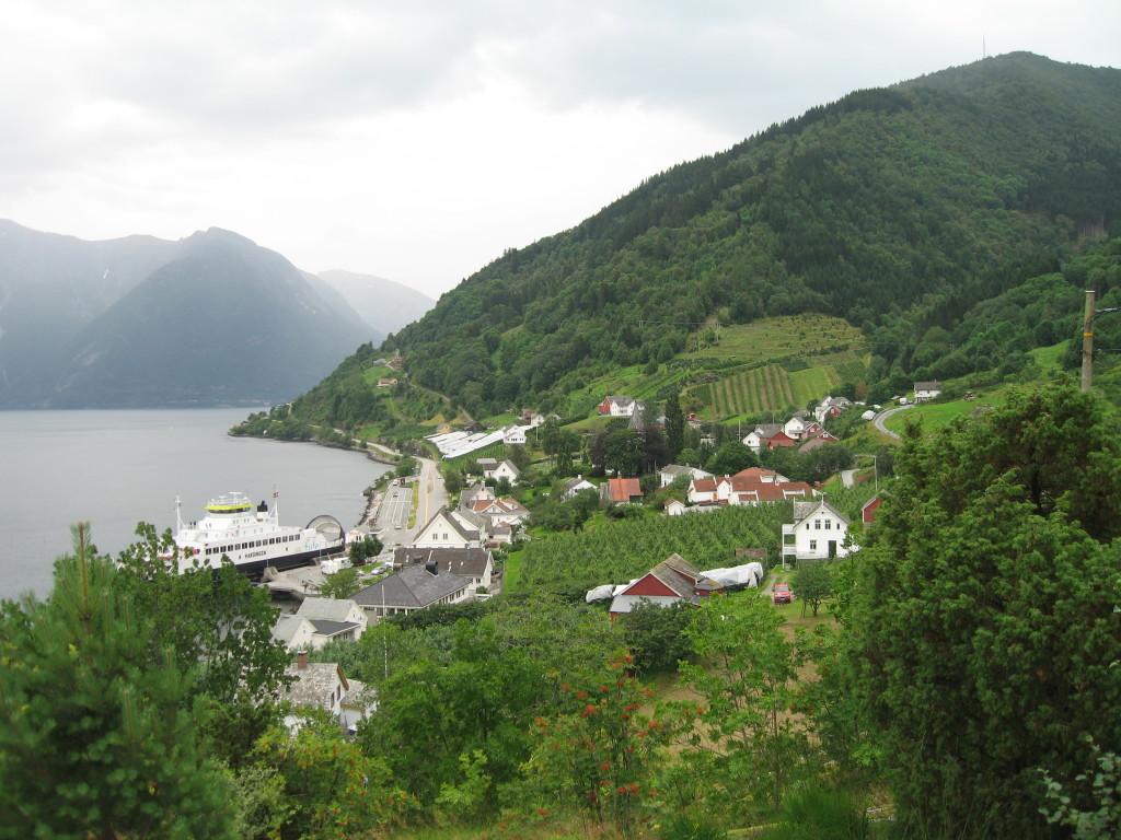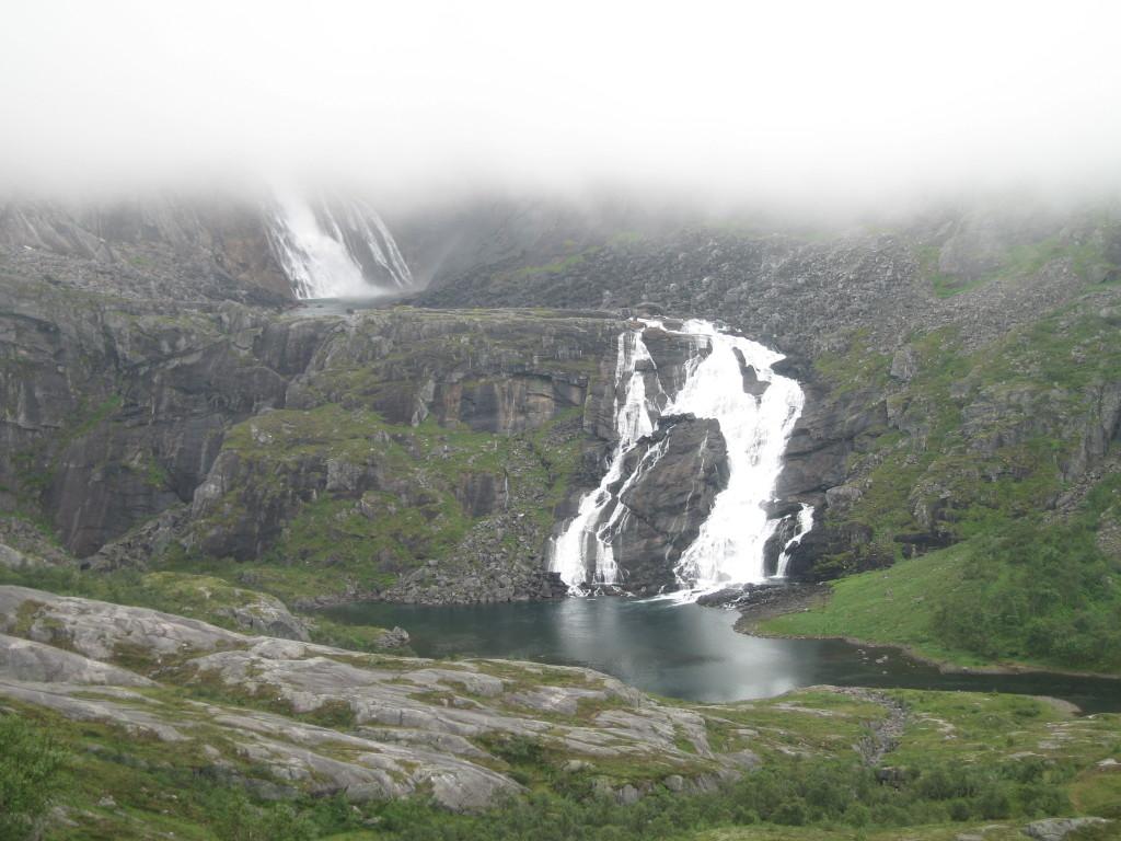 Dag 6 Stavali – Kinsarvik 13 +4 km 5/6 timer. Vi brukte noe mer som vi pleier. Startet dagen i småregn og tåke nesten helt nede på bakken. (foto 083) Vi var litt bekymret for glatte svaberg i nedstigningen. Den startet på ca 1100 m og endte nesten nede ved fjorden. Men tåka letnet og bergene tørket. Den vakre Søtefossen kom gradvis til syne under tåka. Nedstigningen var bratt og delvis kronglete der det ikke var svaberg å gå på. Vi kom ned til en idyllisk slette med turens siste spisepause og sikt oppover stien der vi kom ned (foto 095). Vi kom videre til Nykkjesøy, et vakkert og idyllisk sted med utsikt til Nykkjesøyfossen. Det duftet varm furuskog og det var tørt og fint. Vi valgte en anleggsvei gjennom Husedalen, siden de fleste føtter begynte å få nok av røtter o.l. Vi passerte Nyastølsfossen og Tveitafossen. Vakkert var det. Vel nede på asfalten bestilte vi taxi. Det var herlig å komme til gamle og ærverdige Utne Hotell med tilhørende luksus både i mat, drikke og gode hotellsenger.