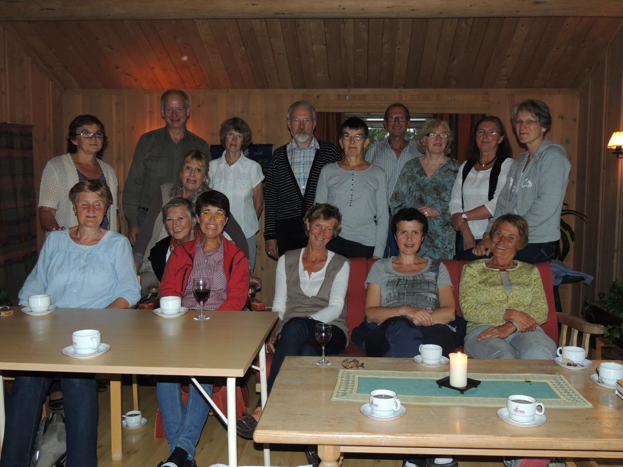 En fornøyd gjeng etter oppholdet på Ruten fjellstue i Espedalen Foran: Kari B, Emmy, Inger, Maj og Kari S - 2. rad: Anne-Gerd, Bent, Anna Stine, Gunhild, Liv, Svein, Britt Anne, Bjørn, Henny, Kitty og Norun