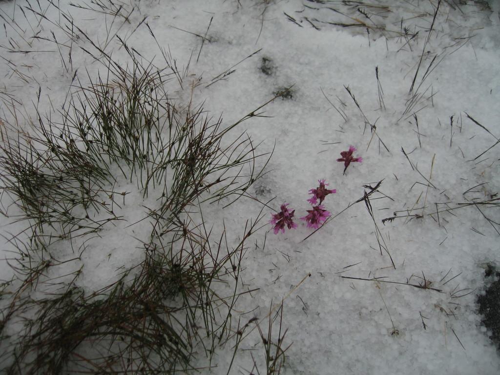 Fjelltjæreblom nesten dekket av hagl i Grevskardet.