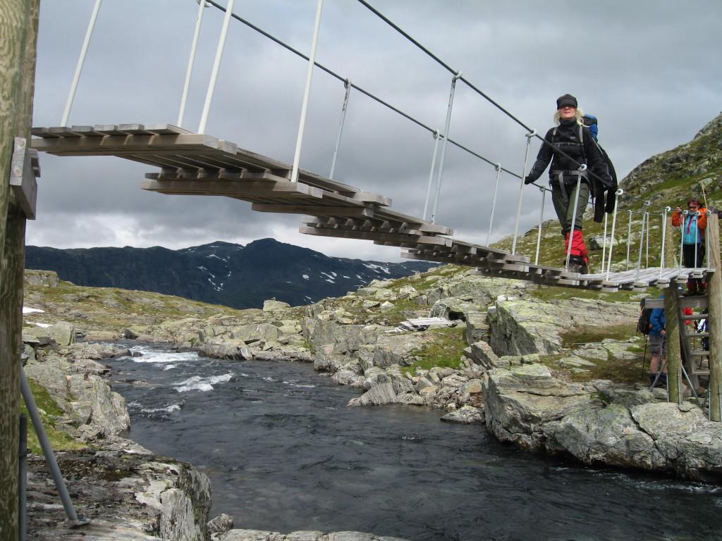 Stine over hengebru før nedstigningen mot Geiterygghytta.