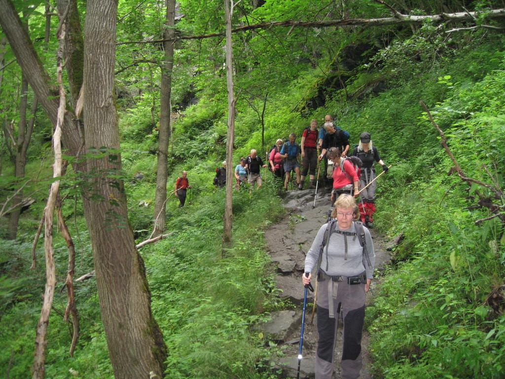 Gjengen på vei opp gjennom Aurlandsdalens regnskog. Tove i tet.