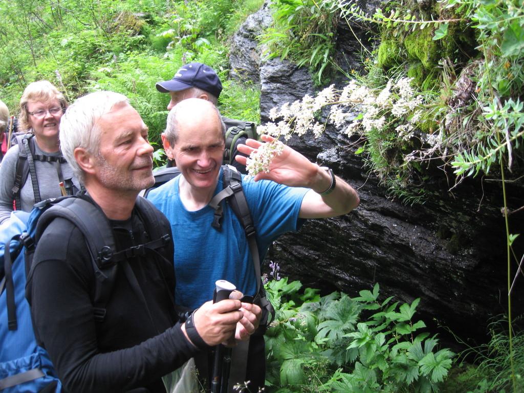 Jarle og Per studerer en av Norges to nasjonalblomster, Fjelldronning/Bergfrue.