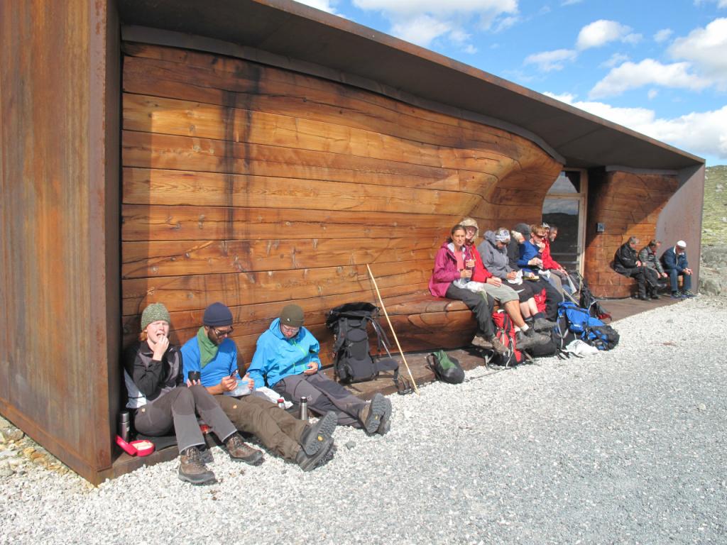 Søndag 10. august var hjemreisedag. Den benyttet vi fullt ut med besøk på Viewpoint Snøhetta. Denne flotte, bølgete tre-hytta med panoramautsikt mot Snøhetta, er prisbelønnet og tegnet av, ja nettopp, Snøhetta Arkitektfirma. På vegen opp dit kunne vi lese om Dovres lange og interessante historie. Dette ble en flott avslutning på vandringen vår.
