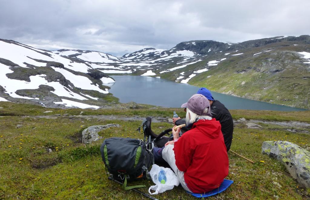 Første pause opp fra Finse. Finsevatnet og Hardangerjøkulen i bakgrunnen.