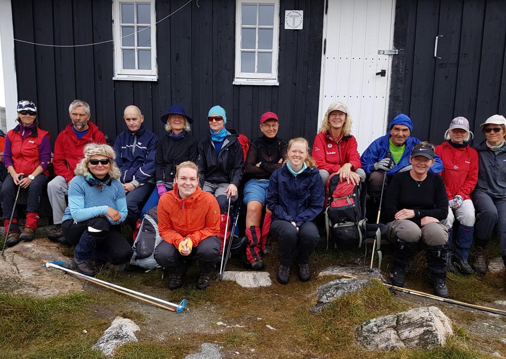 Hele gjengen foran hytta etter en natt med 12 senger fordelt på 36 personer. Foto: Anna-Stine Johnsen