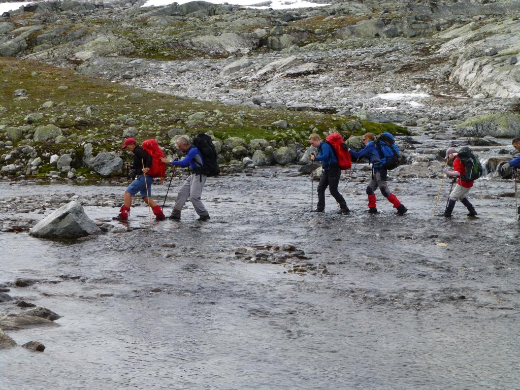 Perfekt vading/steingåing av elv: Bente og Jørund, Maria og Lars, Else og Ted.
