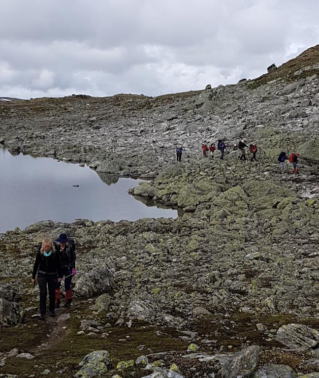 03.08. Etter to netter på Finsehytta, gikk vi 15km til Geiterygghytta som befinner seg 1224 moh. Det hele startet med stigning de første 8 kilometerne, i mye ulendt og steinete terreng. Vi hadde to fine spisepauser med flott utsikt. Litt yr, men fint turvær. Den oppsummerende kveldspraten konkluderte med at vi hadde hatt en svært flott, men krevende tur, og alle gikk slitne og litt lemstre til sengs.