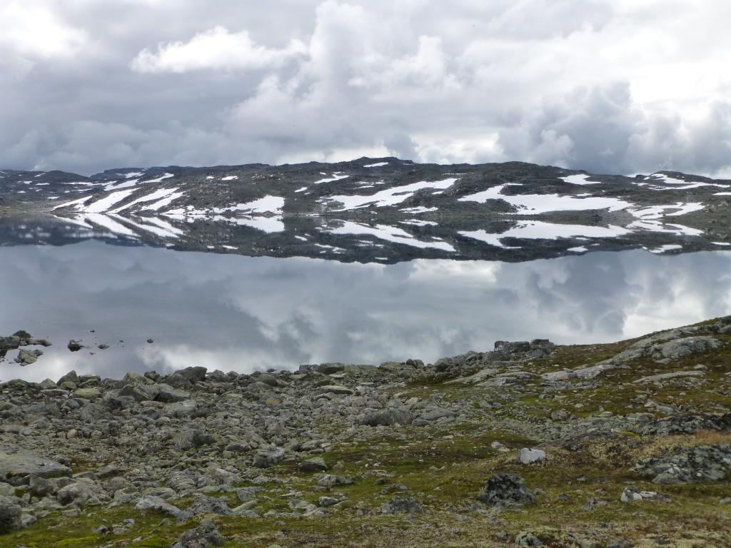 Utsikt fra dagens første rasteplass: Speiling i vannet av snøflekker som gir et bilde av fiskebeins-skjelett.