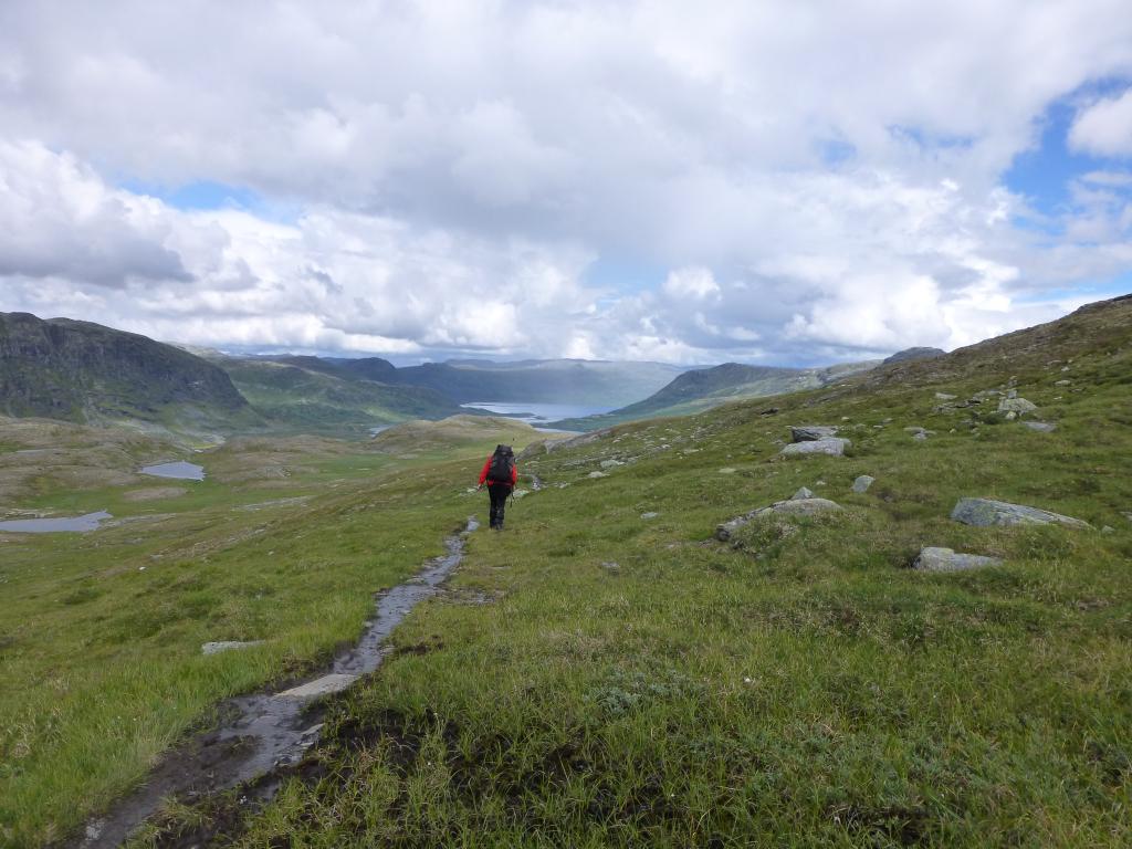 Bratt nedstigning mot Storestølen, 1000 moh. og Strandavatnet.Hallingskarvet i bakgrunnen. Takk for turen.