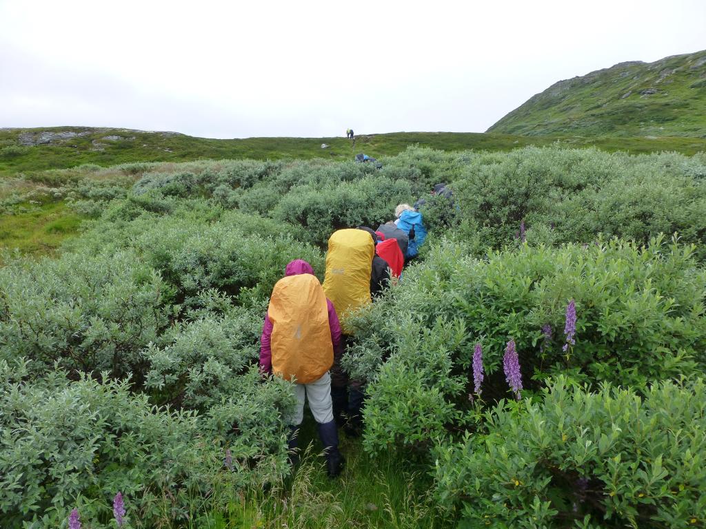 Vi pløyer oss gjennom vierkratt etter båtskyssen: Else med flere blir omtrent borte i det grønne.