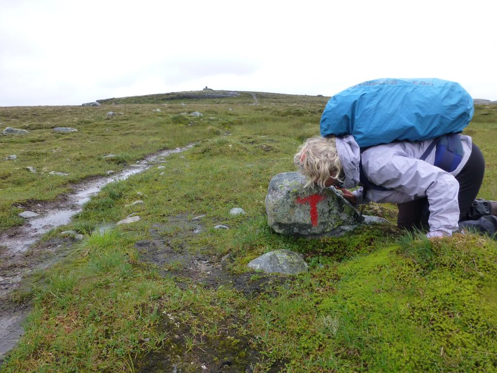 Tilbake på stien over Flyane: Marit kysser den røde T’en.