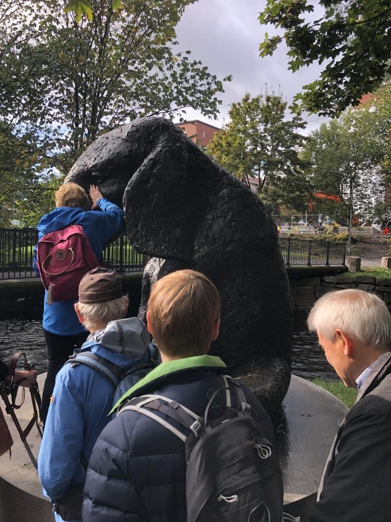 Vi tok det med ro, for det var mye spennende og fint å se og ta på. Vi undersøkte bl.a. skulpturer av en elefant og fire fabrikkjenter. Et gammelt vannhjul måtte også studeres.