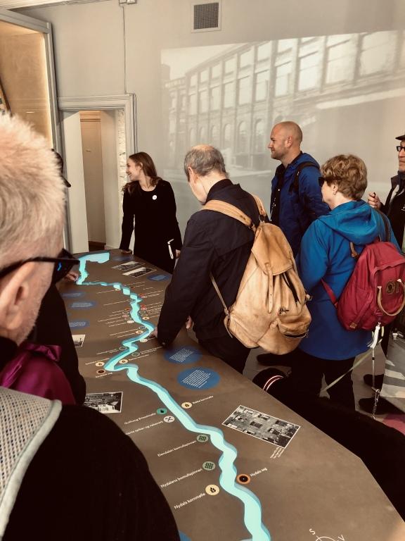 Vi studerer en skisse av akerselva inne på Arbeidermuseet.