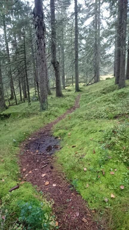 Skogsti med irrgrønne moser på begge sider. Foto: Ellinor Trollebø.