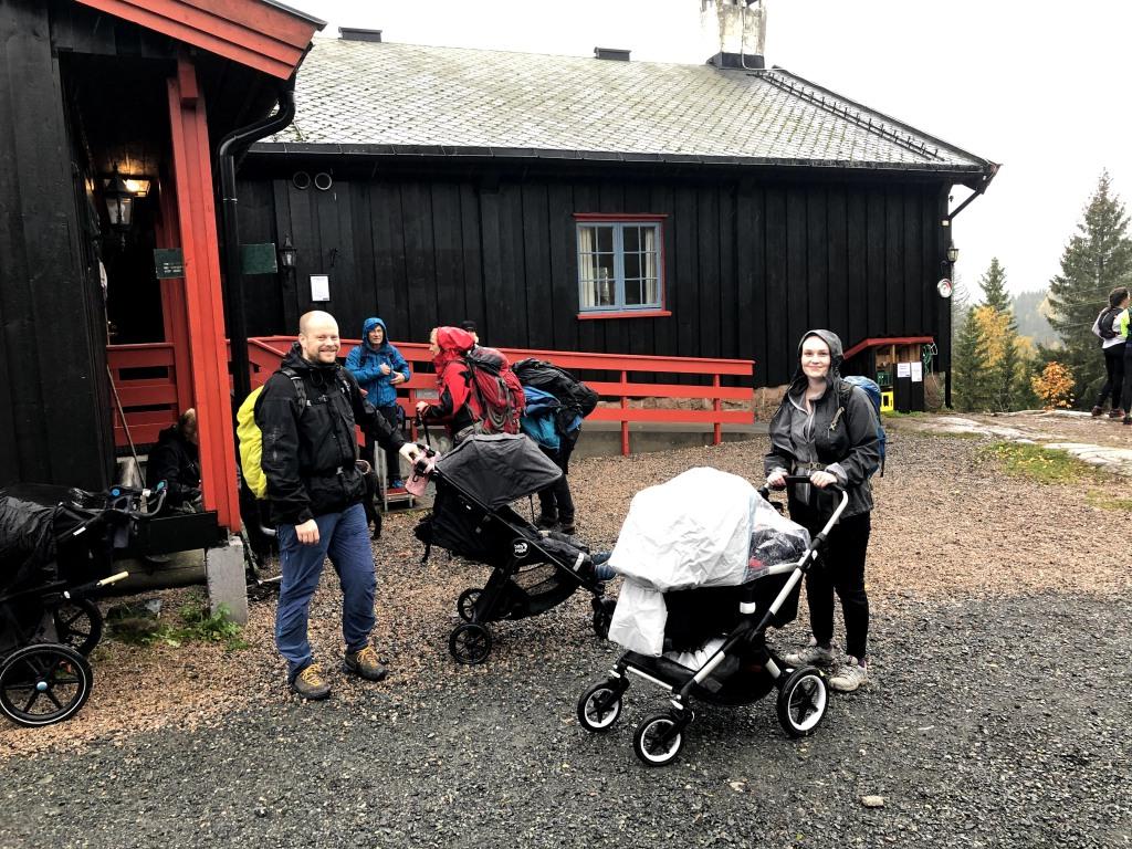 Ankomst hytta: Maria og Øystein med barnevogner på tunet.