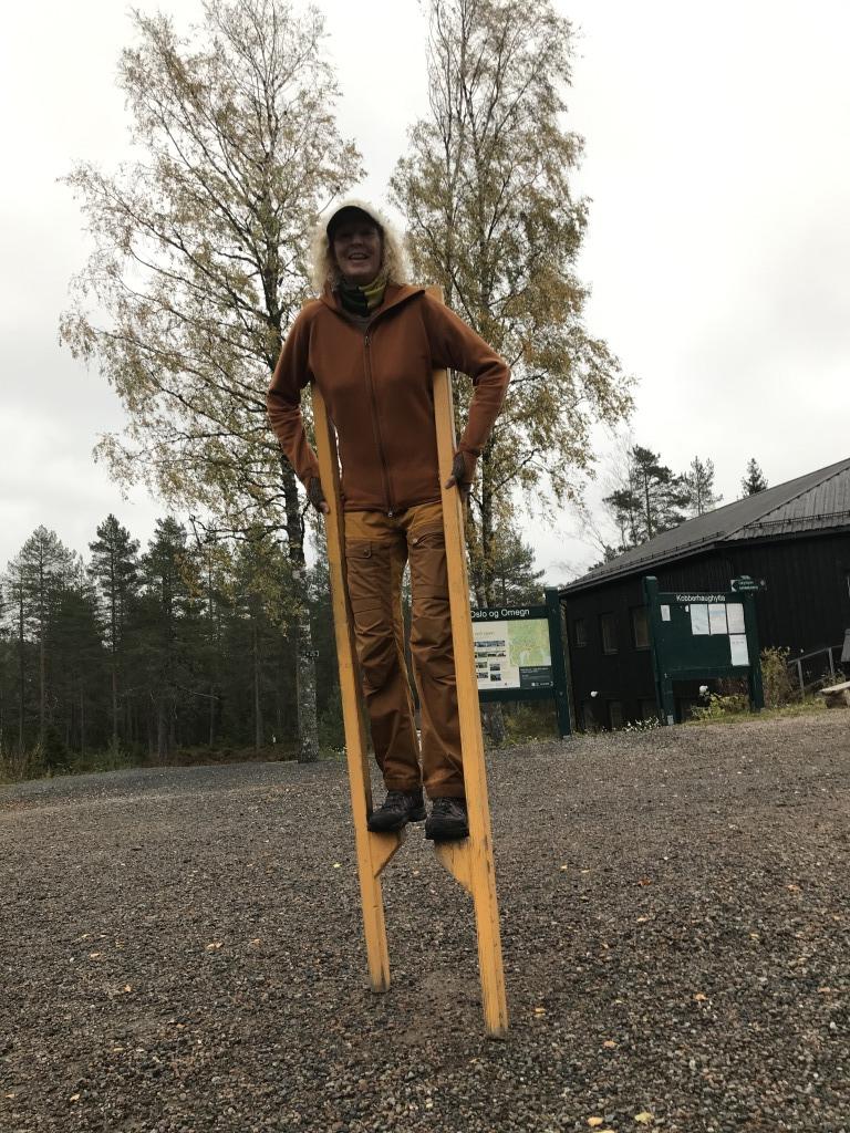 Tiril på stylter på tunet. Foto: Else Aaseth.