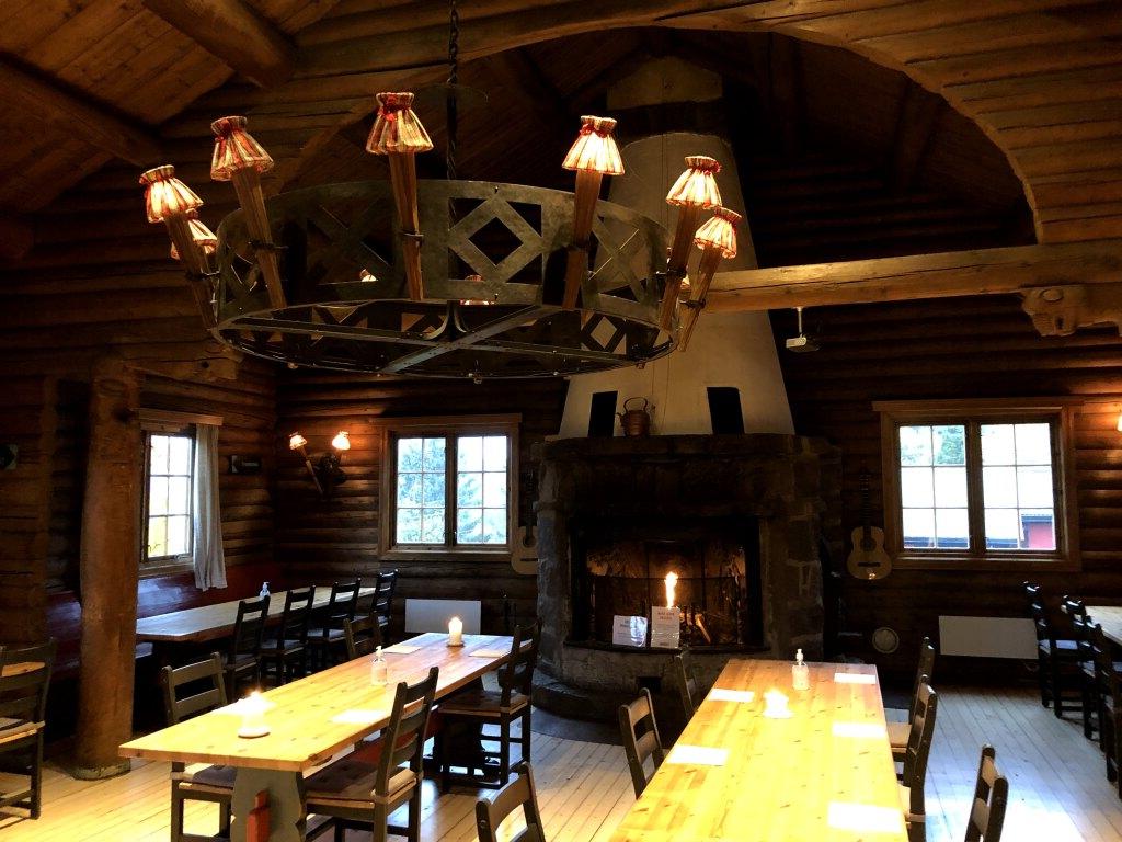 Den store spisesalen i norrøn stil med en diger lysekrone i taket.