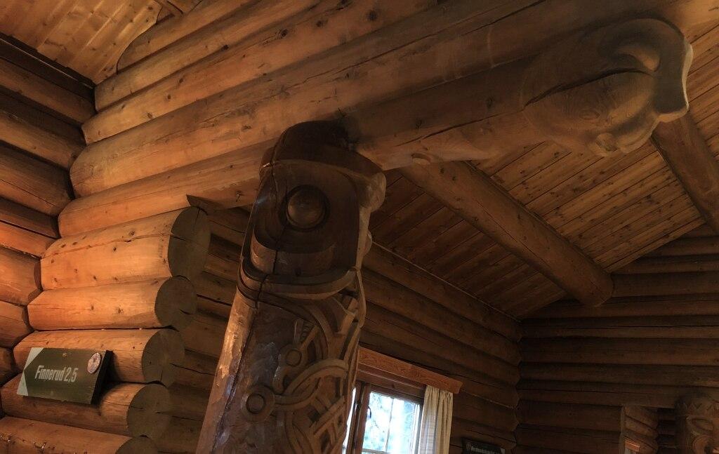 Detaljer fra interiøret: Stolper med norrøne guder.