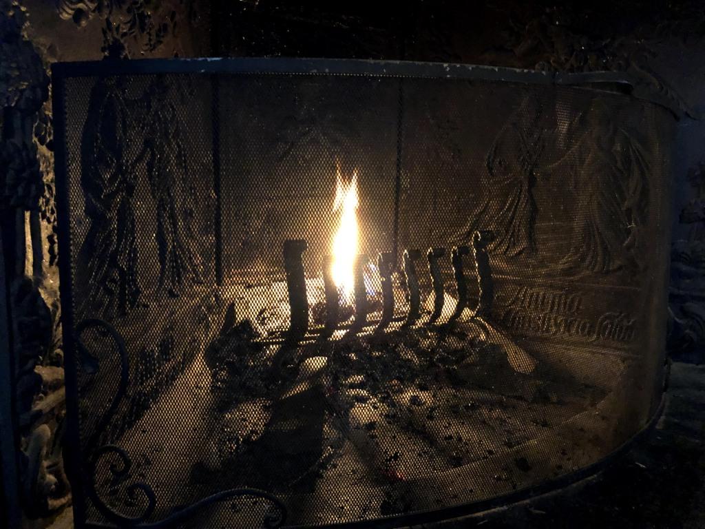 Peis med relieffbilder i smijern.