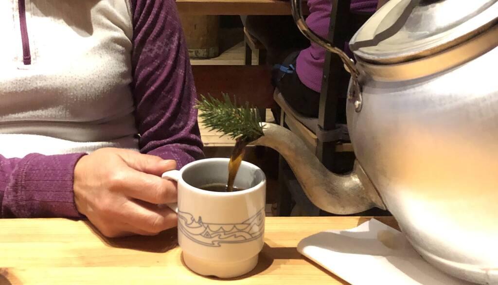 Kaffeservering fra «bedehuskjele» med en grantust i tuten.