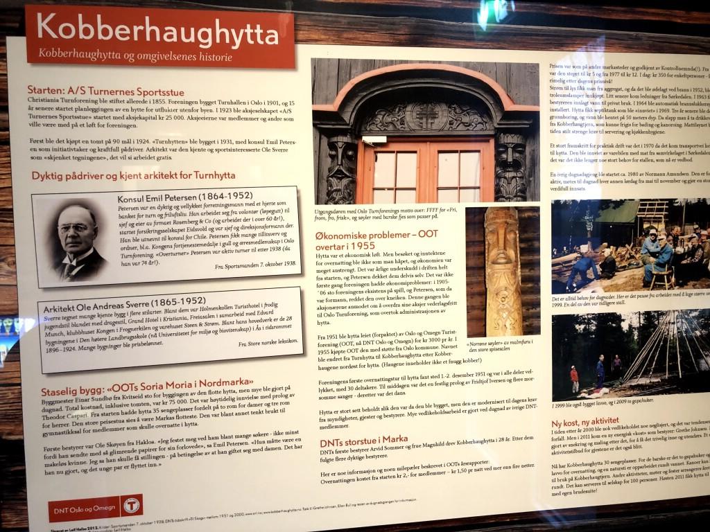 Plakat med hyttas historie, samlet og skrevet av Leif Halbo i 2012.
