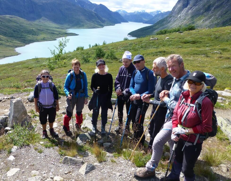 Ettermiddagstur ankomstdagen opp til Bessvatn, 1374 moh: Gjengen poserer med Gjende, 984 moh, i bakgrunnen.