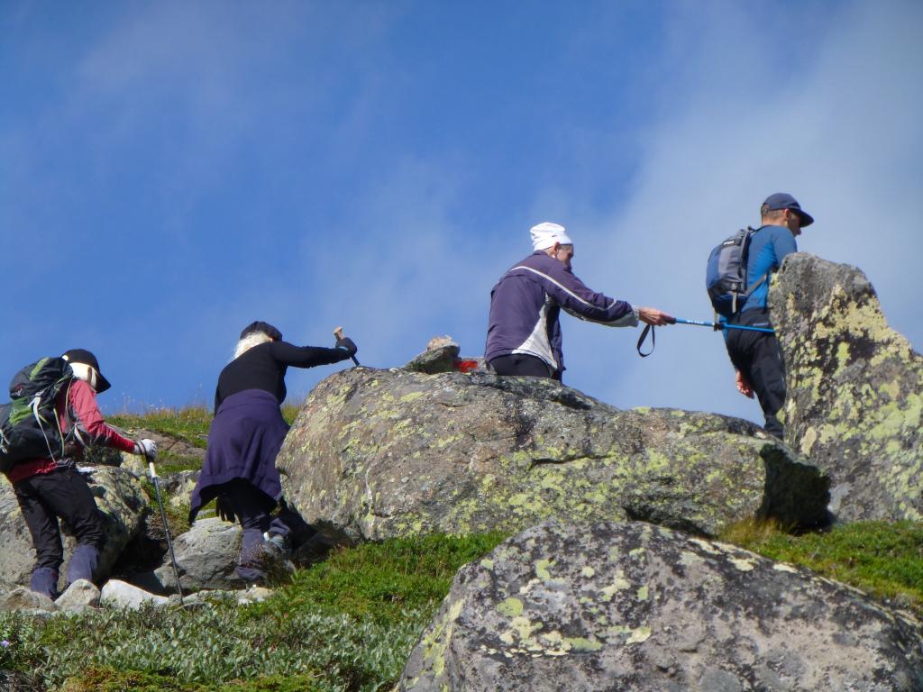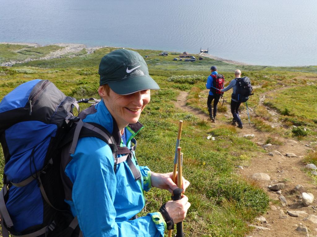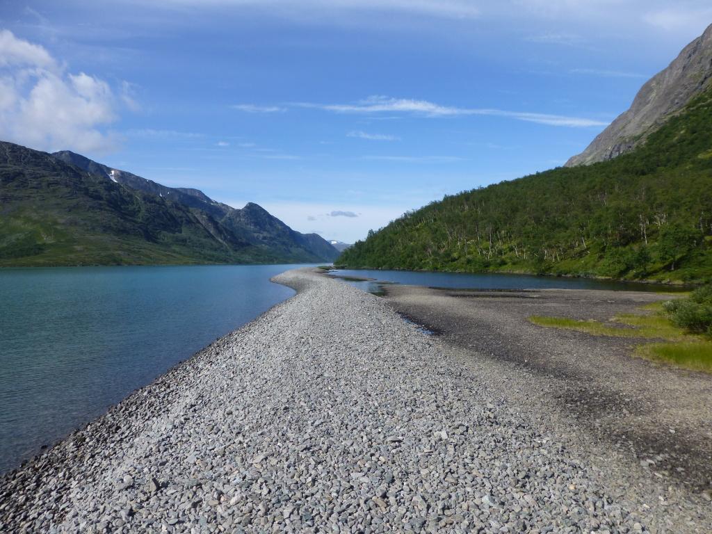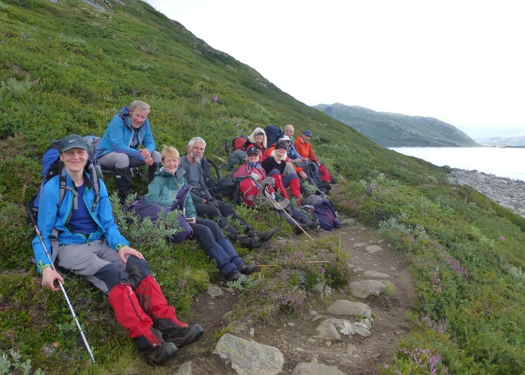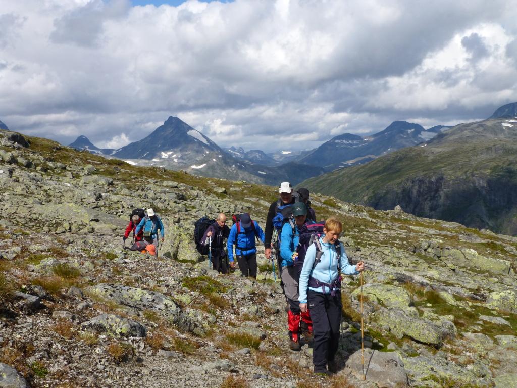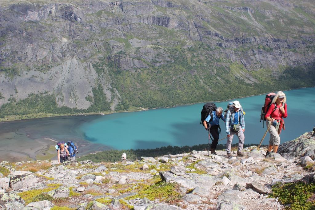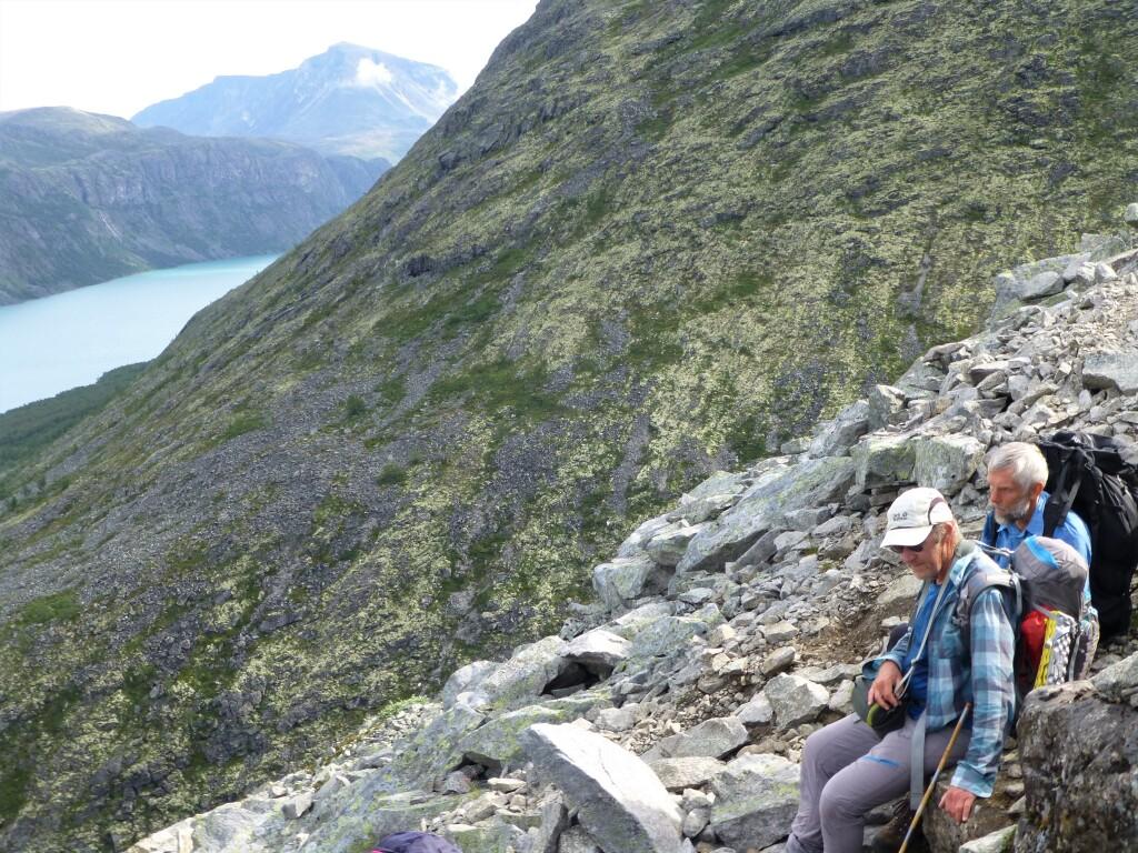 Vi forlot Gjendesheim og satte kursen vestover langs Gjende, innunder Besseggen. Da slapp vi å gå i kø. Terrenget viste seg å være svært krevende med masse steiner og enkelte steder bratt ned. Vi tok pause på ei lita strand, og en av karene hoppet i vannet. Turen videre gikk til dels bratt opp og ned. Vakkert var det med usedvanlig frodig vegetasjon så høyt til fjells.