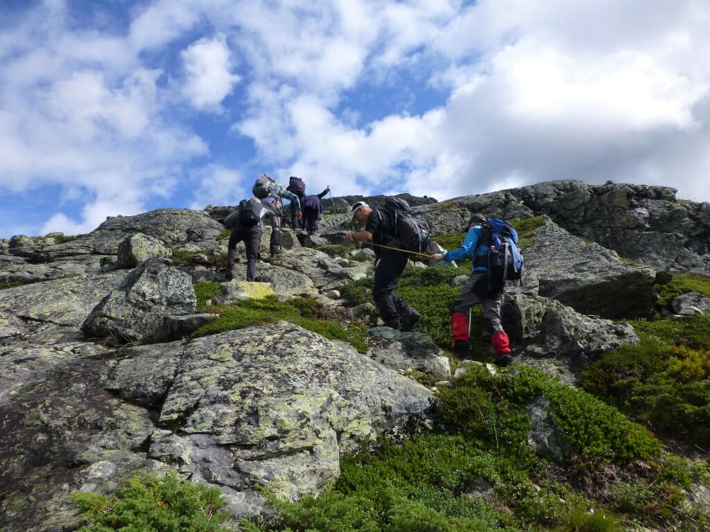 Vi klyver mellom, rundt og over store steiner på vår vei mot dagens mål.