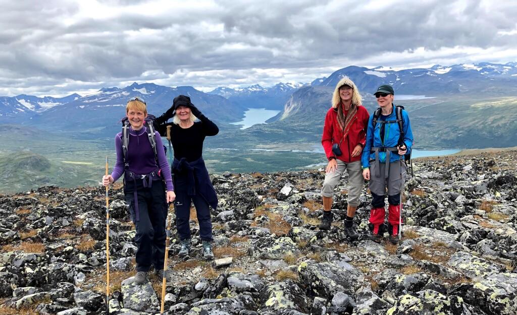 Fornøyde fotturister med utsikt mot Gjende og resten av Jotunheimen: Kjersti, Stine, Tiril og Lars.